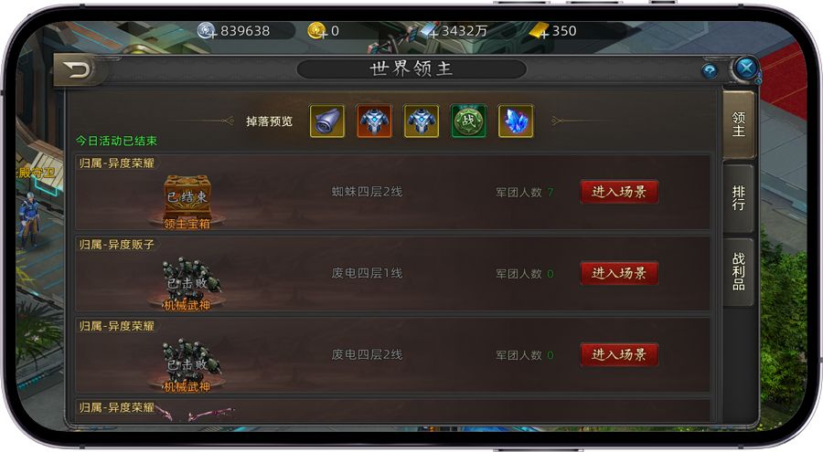 世界领主是以军团为单位进行的BOSS争夺玩法,活动时间内固定地图会刷新BOSS,击杀后会掉落大量装备、材料、金色图纸。