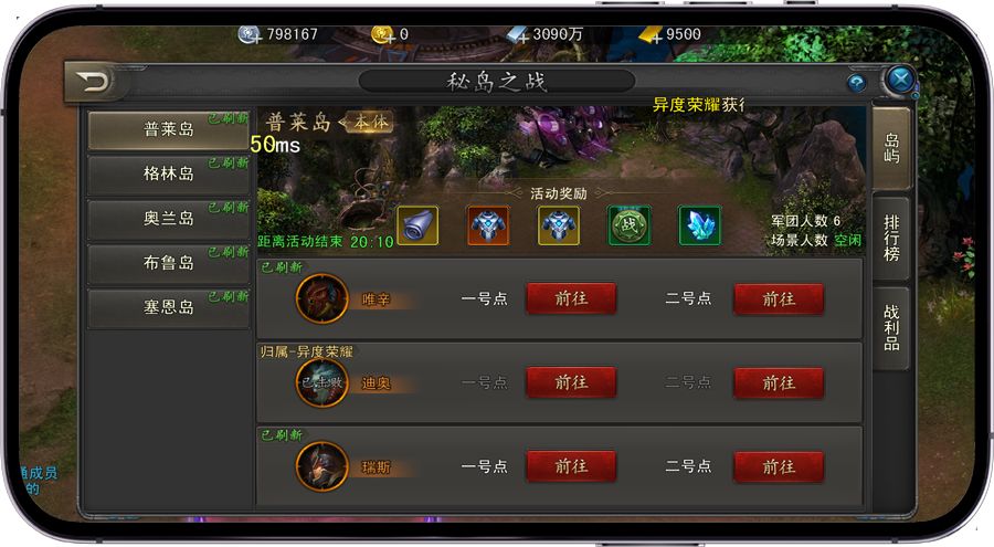 一、秘岛之战活动开启时,在后五个不同岛屿会刷新在六个点位内随机刷新三个BOSS,需要玩家前往对应点位击杀BOSS,击杀BOSS后概率掉落暗金装备、金色图纸以及材料等物品。