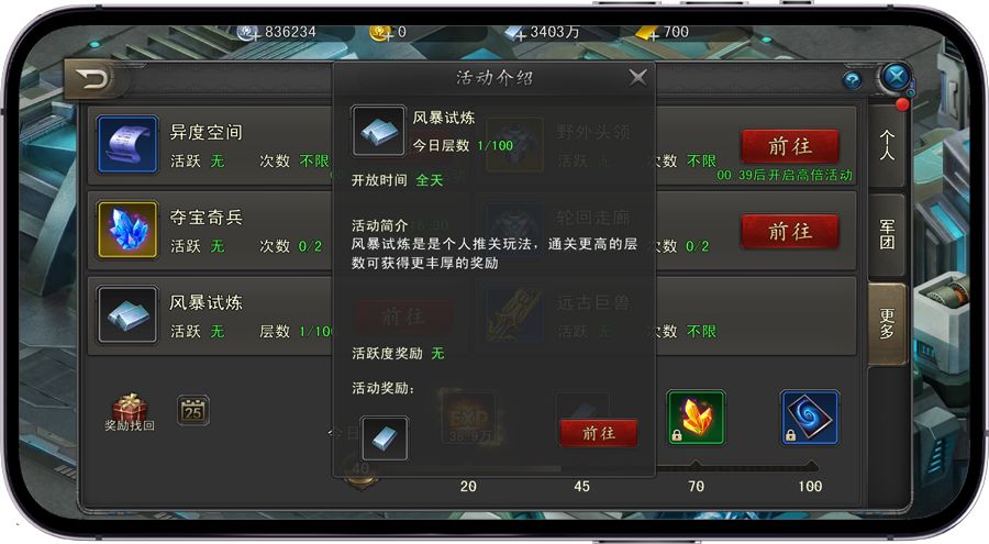 风暴试炼是是个人推关玩法,通关更高的层数可获得更丰厚的奖励