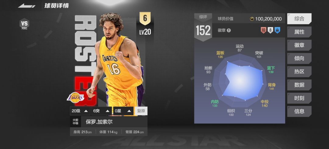 09版加索尔的篮板能力不错,拥有131的进攻篮板和140的防守篮板,同时他的篮板徽章也很全,拥有银卡位怪兽和铜冲板大师,配上大模型,让他在内线不输给任何篮板痴汉。