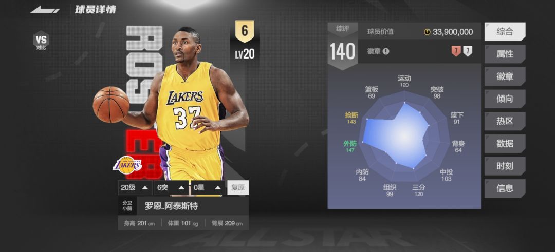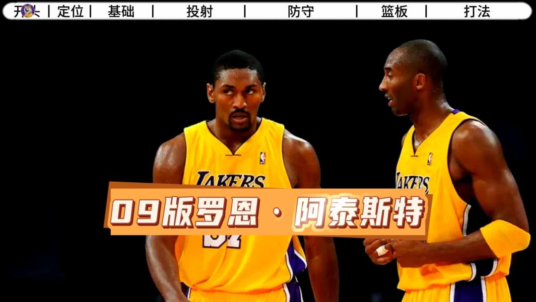 这个版本的阿泰拥有147的外防,147的横移和145的抢断!再配上银死亡缠绕和银持球抢断大师等一系列防守徽章,在1对1面对任何球员时都不虚,让他像牛皮糖一样黏住对手,随时的撞停和抢断压迫拉满。但是实战中,我们应当尽量避免使用阿泰换防内线硬C,毕竟内防和模型在篮下没有什么优势。