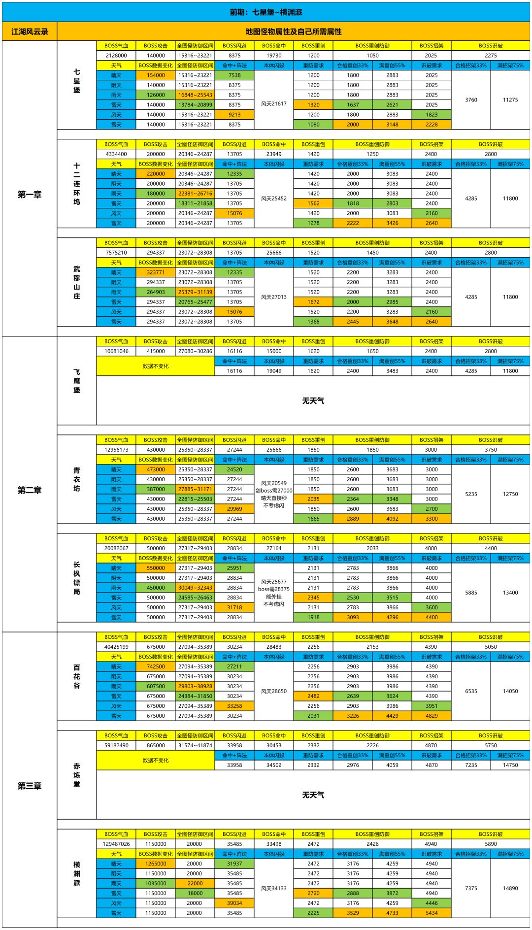 注:防御数值有波动(我记录的是整个图最低防御到最高防御的数值区间),数据变化是boss属性变化,数据变化右边蓝色的则是自己所需达到的数值(我是直接推算boss属性后直接算我们需要多少属性,这样就方便看),额外如果地图有特殊机制加成属性或者怪物武学带属性加成就没计算进去(甄梅不同职业就都算进去了)