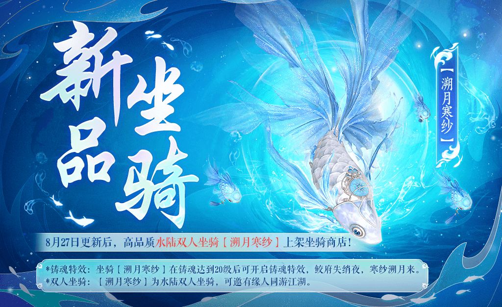 活动内容:浪漫高品质水陆双人坐骑【溯月寒纱】上架坐骑商店,可邀有缘人同游江湖!