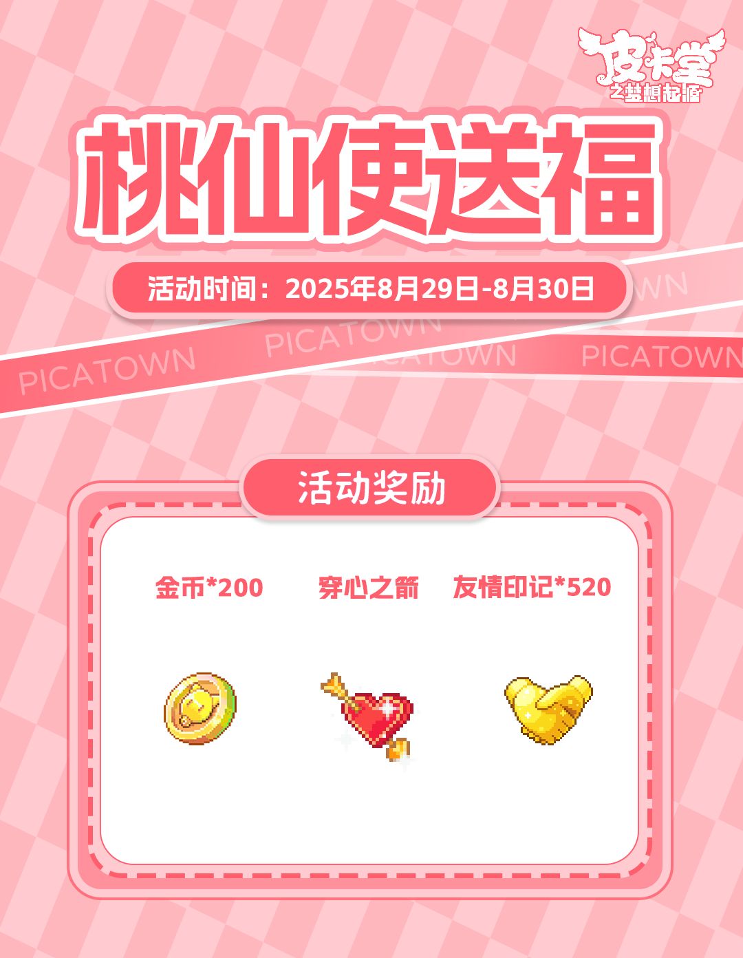 -【桃仙使送福】七夕当天,与月老祠外的桃仙使对话,即可获得穿心之箭*1,金币*200,友情印记*520哦~(仅8月29日6点00分~8月30日5点55分出现)