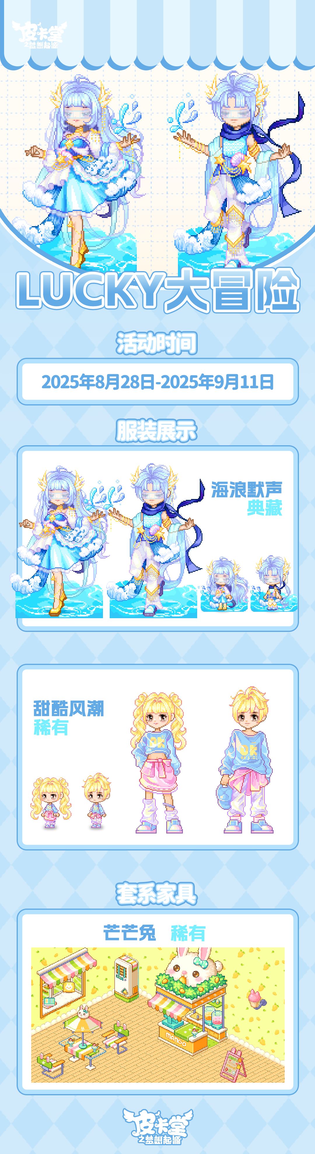 -【LUCKY大冒险】上新典藏套装「海浪默声」、稀有套装「甜酷风潮」,套系家具「芒芒兔」!