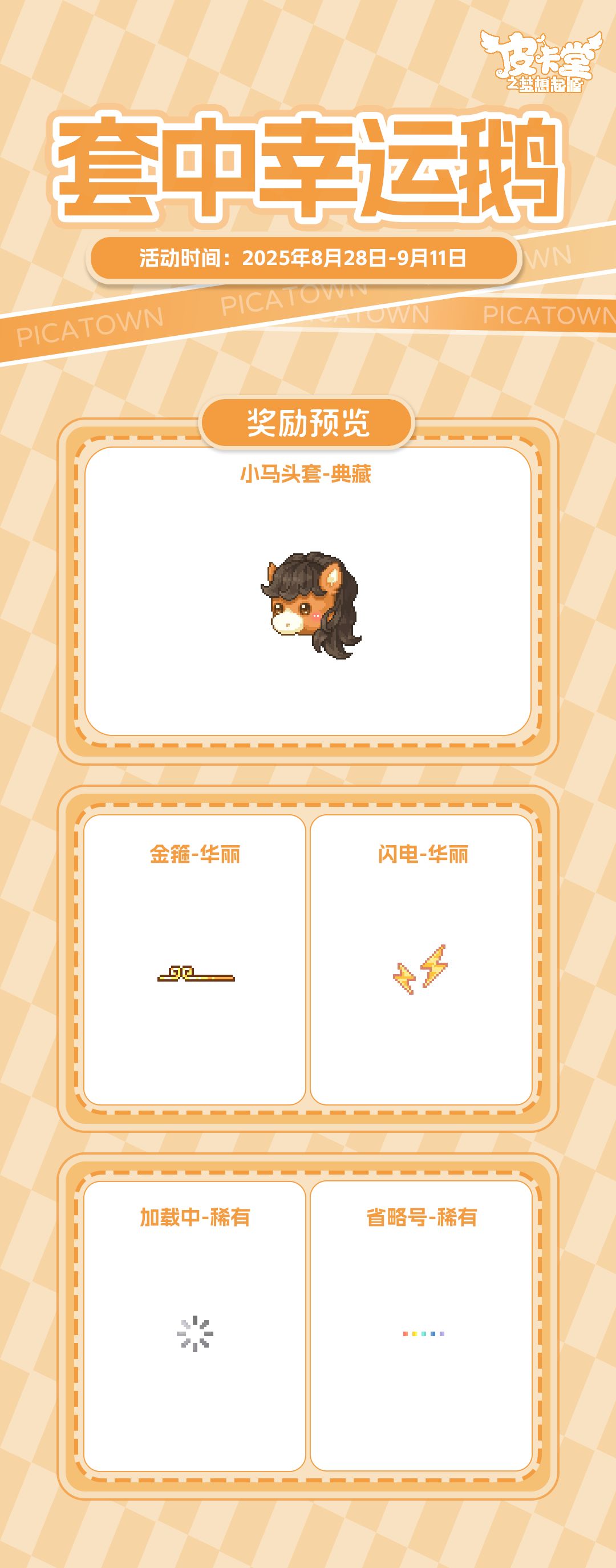 -【套中幸运鹅】鹅!鹅!鹅!大鹅降临皮卡小镇,是幸运儿套中幸运鹅还是幸运鹅逃躲幸运儿?开启礼包将有机会得到精美配饰哦!本次活动产出全新大鹅礼包,不会开出上一期大鹅装扮~