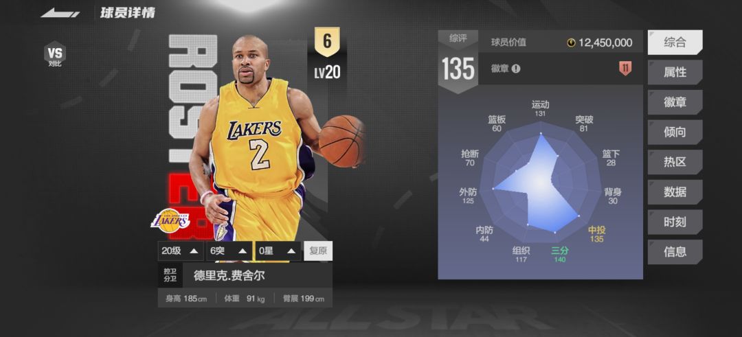 作为紫金王朝的控球后卫,09版老鱼拥有124的和131的运球速度,配上运球老手(铜)和第一步大师(铜)徽章,持球还是很稳的。同时他也拥有十美分和应变大师,这让他有能力在关键时刻为队友送出秒传!