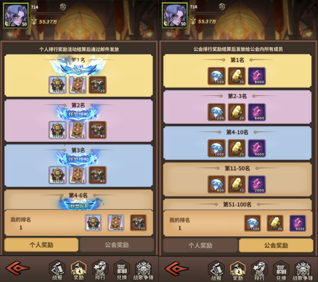 ②公会排行:根据公会内所有成员军功的总和其他公会进行排序。以公会为单位,奖励发放给公会内的所有成员
