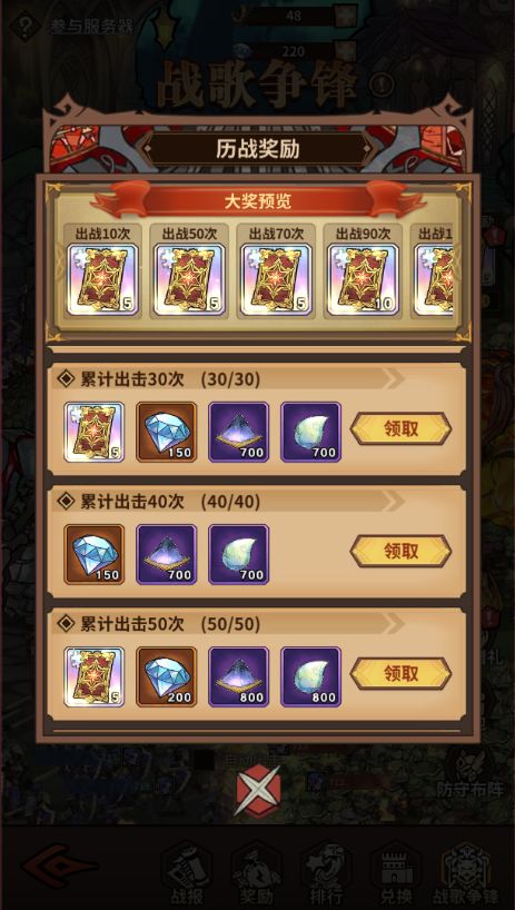 3、玩法简述:战歌争锋是跨服公会PVP玩法,通过消耗次数出击,采用三局两胜制来挑战分组对手。战斗胜利可夺军功,失败则可以获得荣誉点。勇者们可以善用策略制胜,来获得大奖!