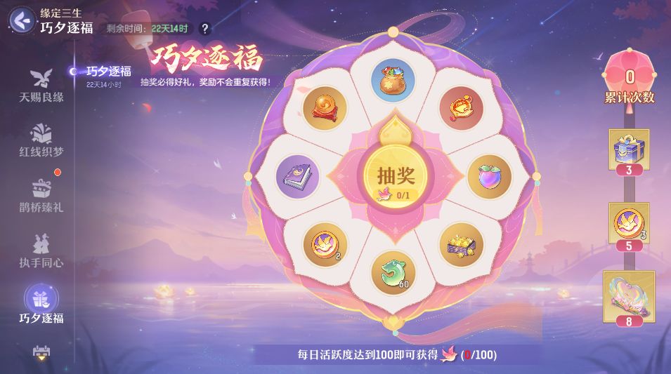 这个七夕,浪漫与惊喜永不缺席!消耗鹊鸣华玉即可参与「巧夕逐福」转盘祈缘~随着祈愿次数累积,还可额外解锁节点专属礼物哦!