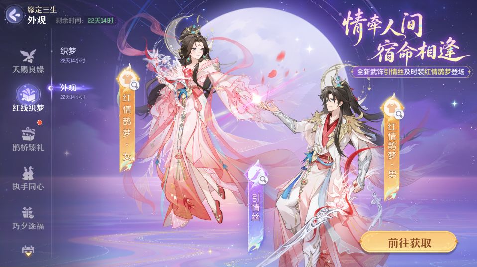 鹊梦翩跹,情丝相牵。全新七夕主题外观【红情鹊梦】、【引情丝】浪漫而至。佩戴【引情丝】武饰可使用专属情缘交互动作,与恋人共度韶光。参与抽奖有机会获得七夕时装、七夕武器、七夕家具。