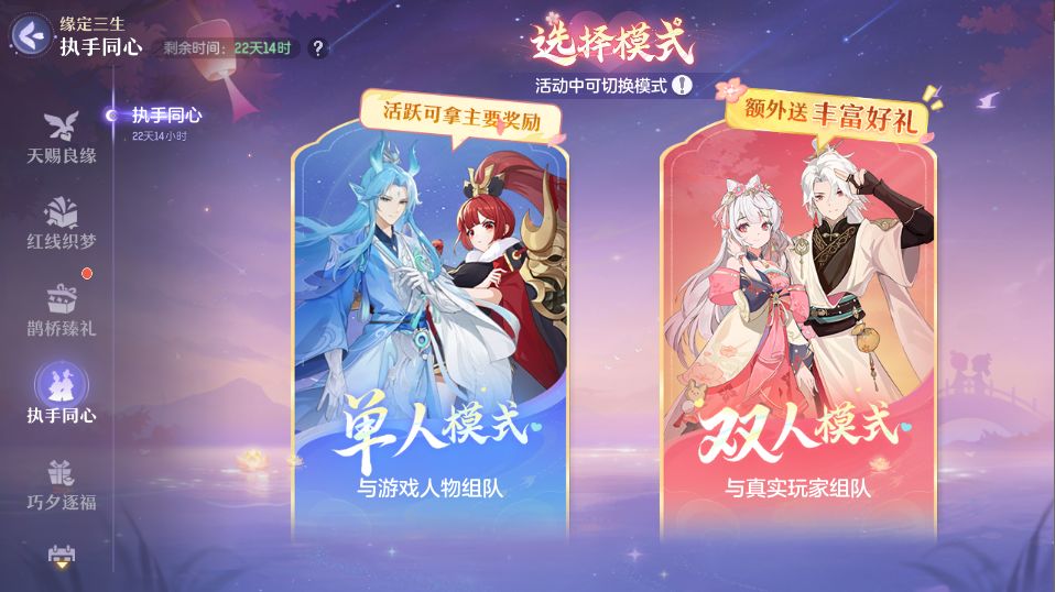 这个七夕,与TA缘定长安!御灵师可选择单人轻松参与,或与有缘人甜蜜组队,共赴佳约。签署鹊语/佳缘约定,双方即可共同领取奖励!
