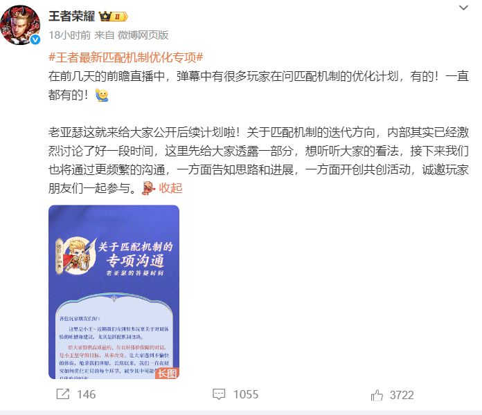 近日,在腾讯《王者荣耀》S41赛季前瞻直播后,玩家对匹配机制的优化计划高度关注。今日,游戏官方正式回应,称一直有相关优化计划,关于迭代方向内部已深入探讨许久,后续将加强与玩家沟通,不仅会及时告知思路和进展,还将举办共创活动,邀请玩家共同参与。