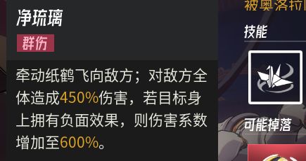 净琉璃:AOE伤害,若我方有debuff就触发一次1050%的巨额伤害。