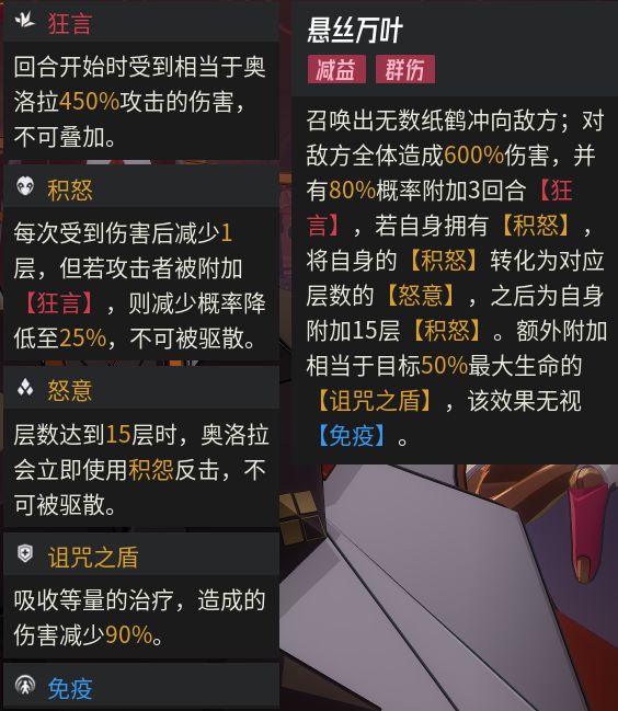 悬丝万叶:给予玩家诅咒之盾会低输出(需要治疗50%以上的生命值才可以解除)、给于玩家狂言(我方回合造成伤害)、狂言驱散不够,就会触发一次AOE攻击。