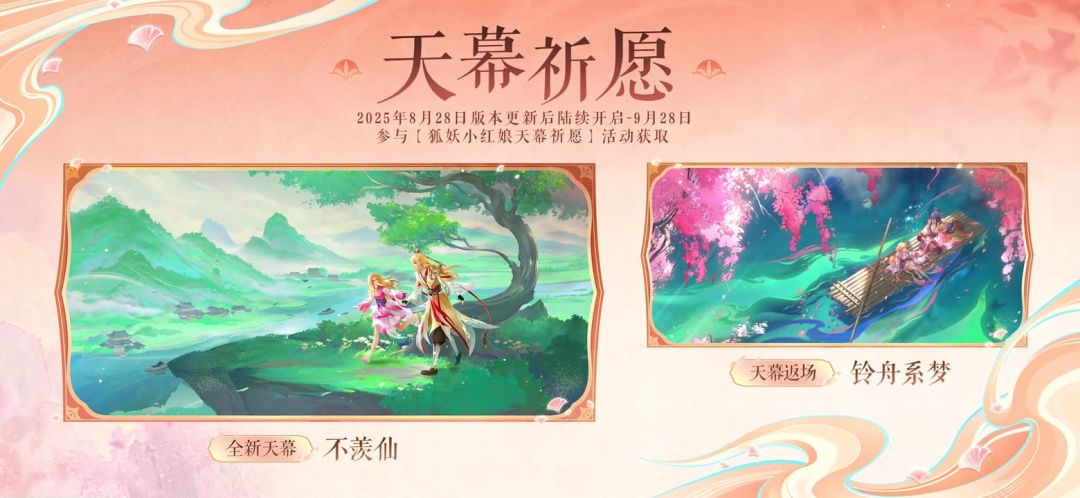 1.【干将莫邪﹣千山共赴】为传说品质限定皮肤,标签为"狐妖小红娘",上线时间为2025年8月28日版本更新后~2025年10月28日23:59。