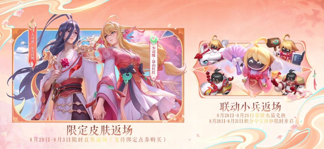 此外,2025年8月28日~9月3日,【少司缘﹣涂山红红】、【大司命﹣东方月初】也将限时返场直售,同样支持绑定点券购买!