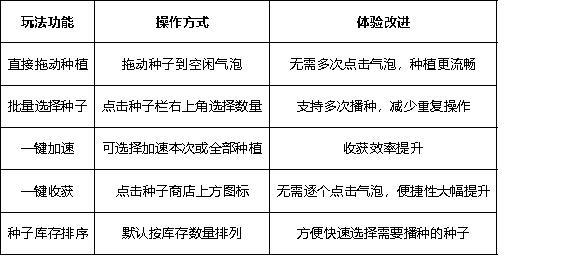 1. 种植体验优化旧版:每次种植需先点击气泡,再选择种子,反复操作繁琐。