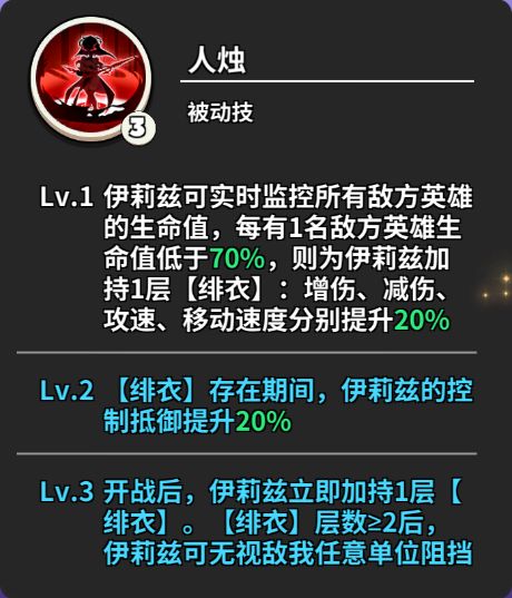 伊莉兹可实时监控所有敌方英雄的生命值,每有1名敌方英雄生命值低于70%,则为伊莉兹加持1层【绯衣】:增伤、减伤、攻速、移动速度分别提升。满级后,伊莉兹开战立即加持1层【绯衣】,且【绯衣】层数≥2后,伊莉兹可无视敌我任意单位阻挡
