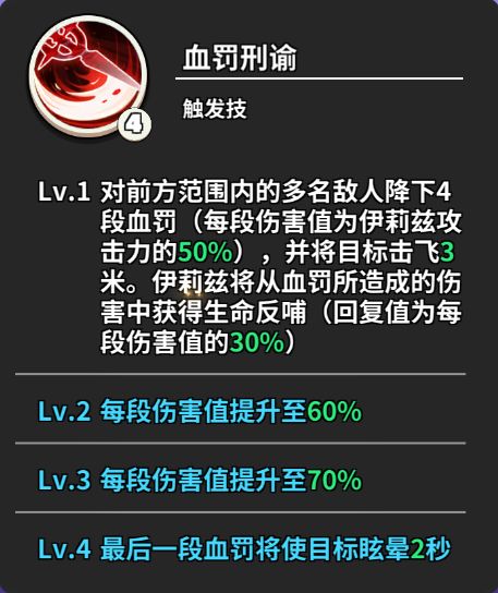对前方范围内的多名敌人降下4段血罚,并将目标击飞。伊莉兹将从血罚所造成的伤害中获得生命反哺。