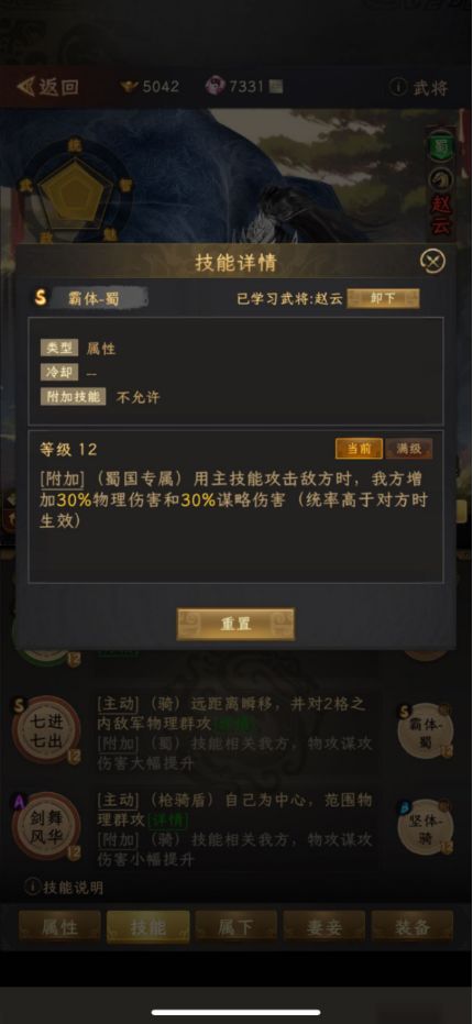 基本机制就介绍完毕了,还有一个比较重要是有些组合是无效的,如图所示,武将所带的被动技能,如果带上霸体这类附加技能,是无法触发出“霸体”等主技能增伤的效果哟。