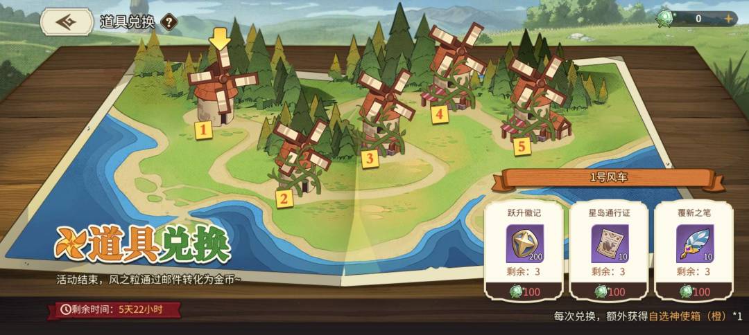 通过积分领取、礼包购买获得风之粒 ,消耗风之粒可在风车内兑换各种资源,越往后的风车奖励价值越高。