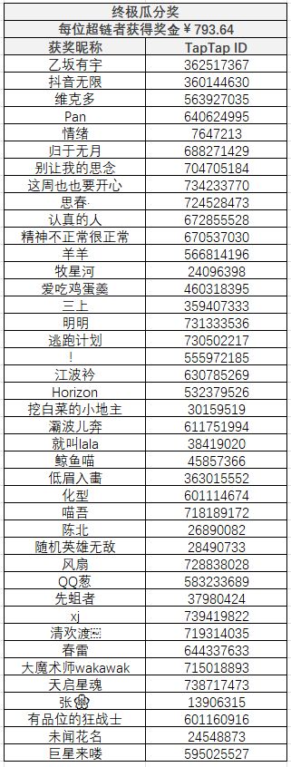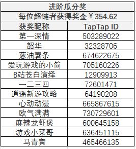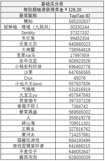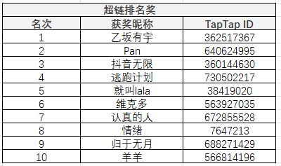 恭喜以下超链者获奖!开奖公示时间为9月11日~9月13日,获奖作品在公示期若核实为抄袭等违规作品,将直接取消作品获奖资格。公示结束后,现金奖励将通过TapTap创作者中心进行发放,请注意查收!
