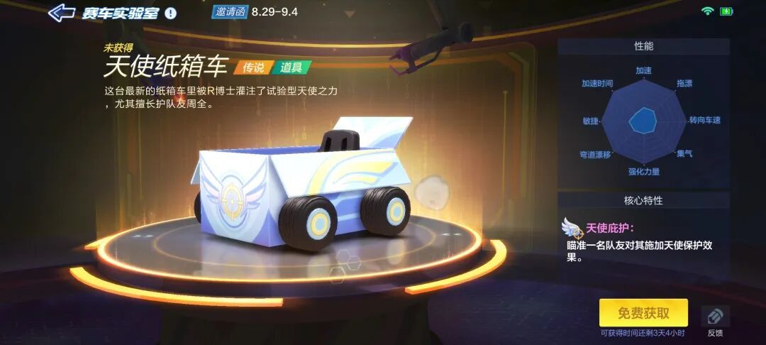 天使的羽翼会轻柔的庇护同伴,放心冲刺吧!8月29日起,新一期赛车实验室开启,传说道具赛车【天使纸箱车】登场,天使之力保驾护航!