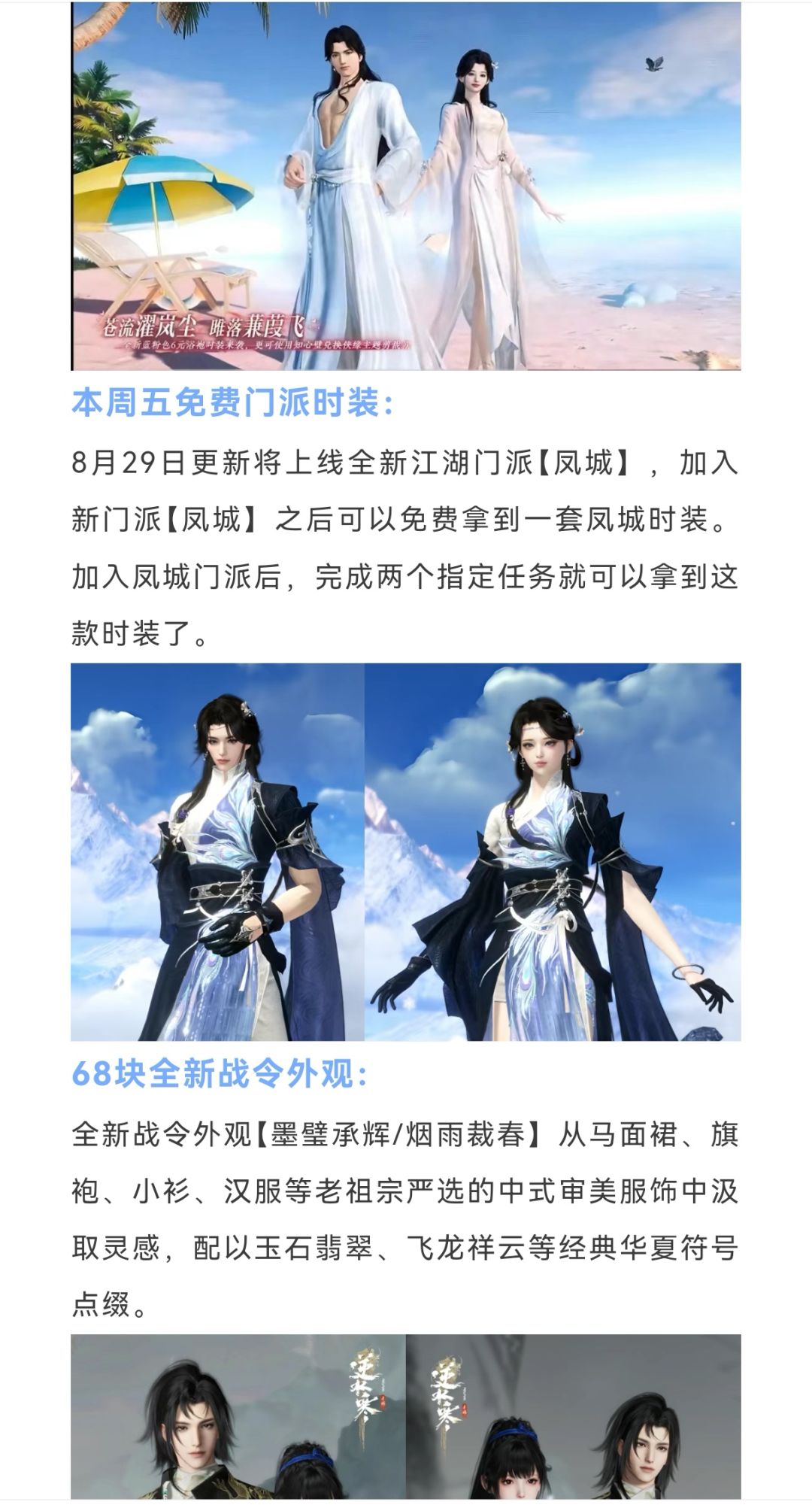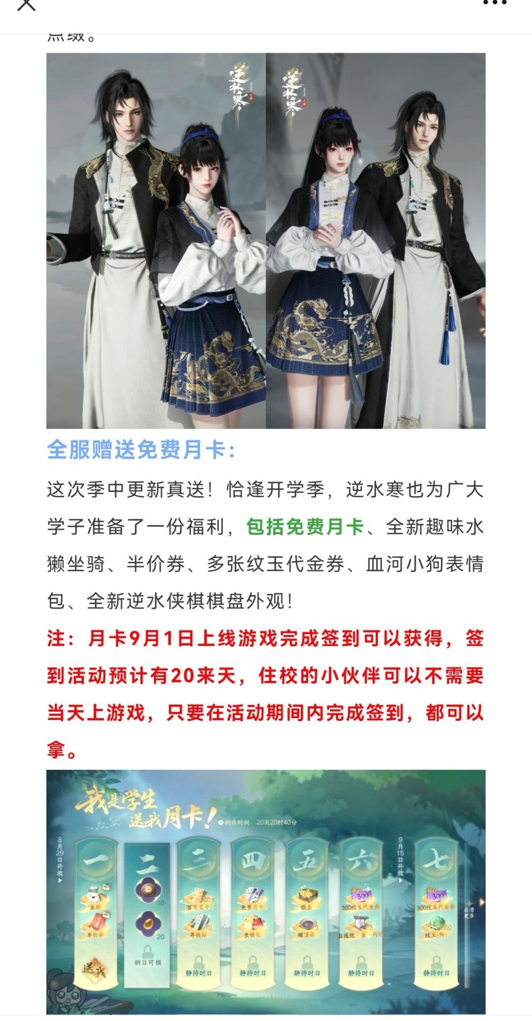 逆水寒全服赠送免费月卡,本周五免费门派时装,免费浴袍时装,68块新战令时装,流派试炼【沧流逐光】机制前瞻