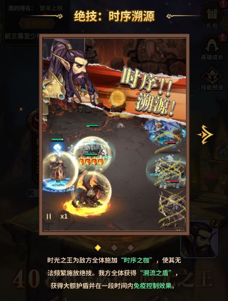 战斗开始时赋予我方全体英雄“时光回溯”,“时光回溯”会在30秒后或目标受到致命伤害时自动触发,每触发1次“时光回溯”,时光之王获得1层“时之悖乱”。触发“时光回溯”时,目标的伤害减免提升50%,持续5秒。