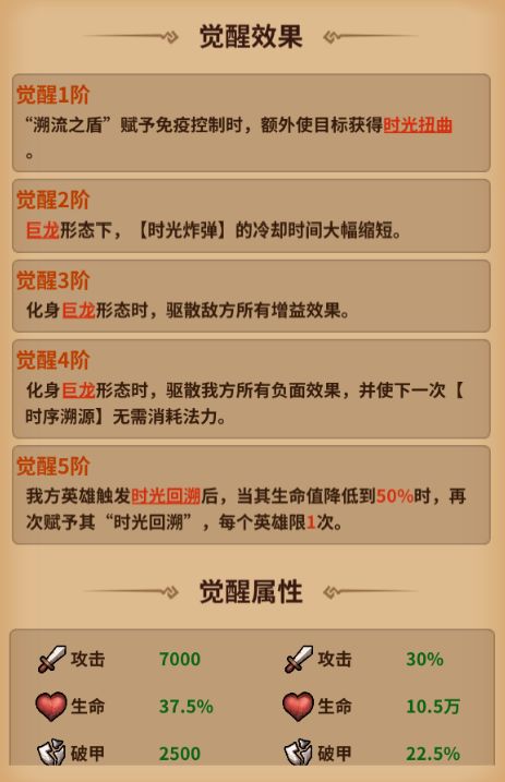 · 觉醒5阶:我方英雄触发“时光回溯”后,当其生命值降低到50%时,再次赋予其“时光回溯”,每个英雄限1次。