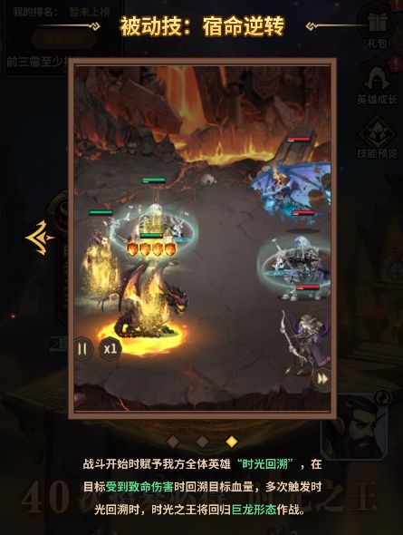我方的“时光回溯”被触发任意2个后,时光之王化身“巨龙”形态,将敌我全体回溯到生命满值,并损毁敌人全部法力值。