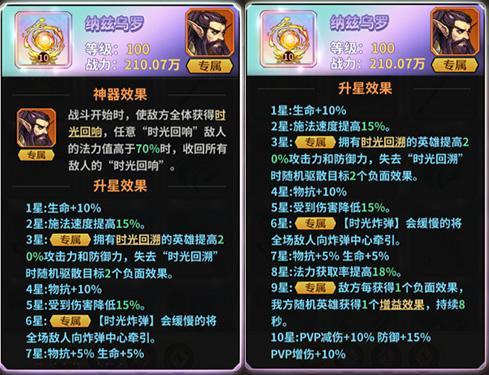 · 专属效果1:拥有“时光回溯”的英雄提升20%攻击力和防御力,失去“时光回溯”时随机驱散目标2个负面效果。