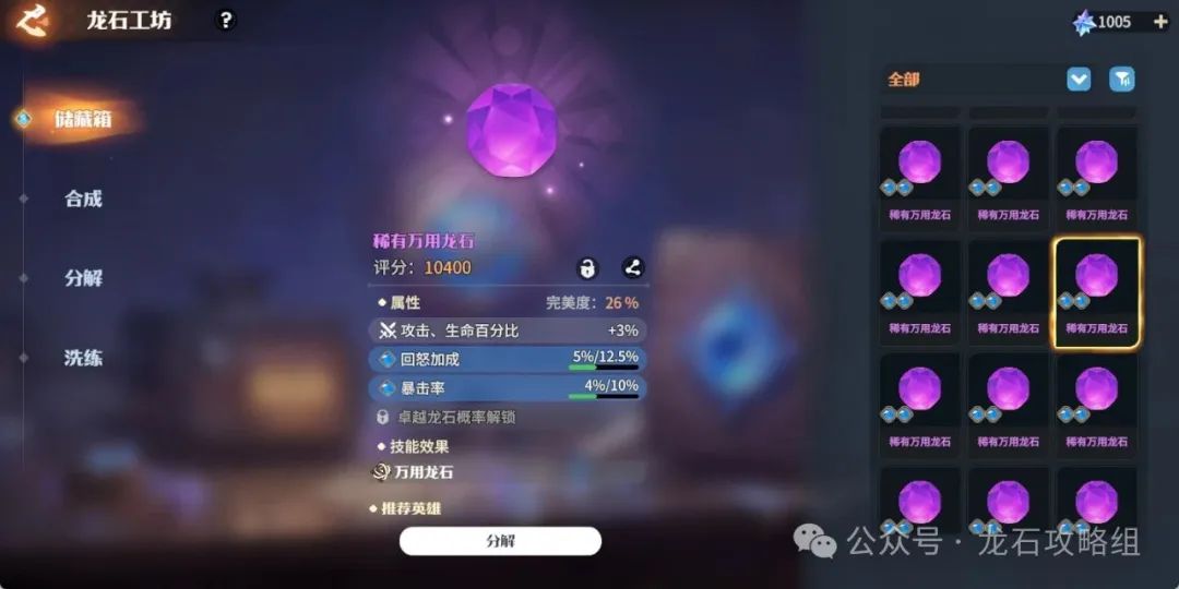 2、尽可能凑一下紫色龙石的回怒词条+攻速词条(大部分英雄通用)。