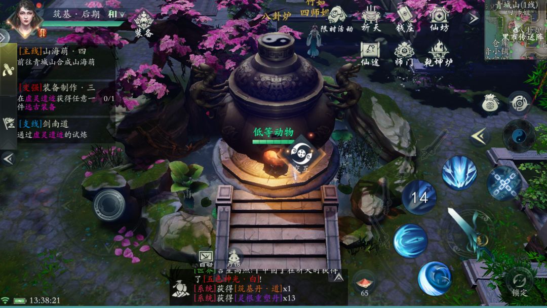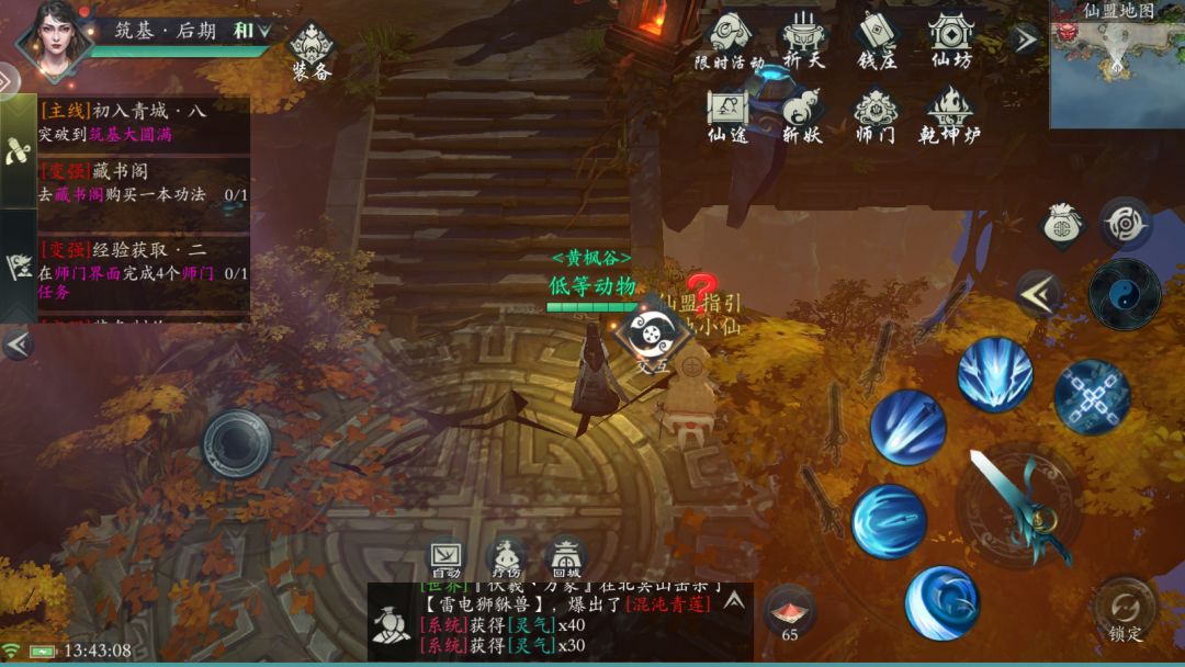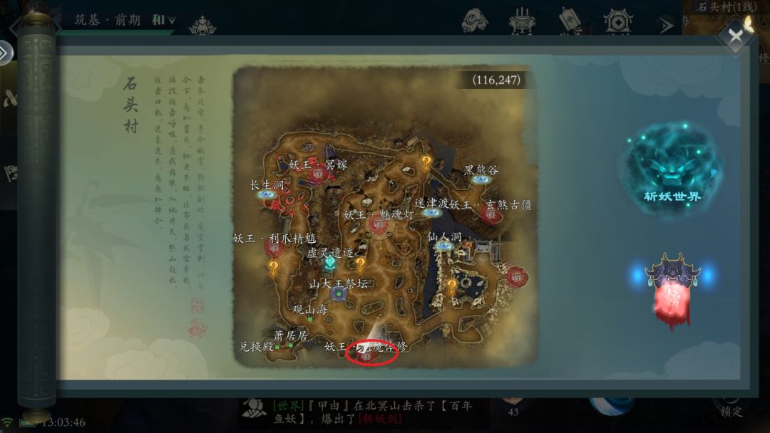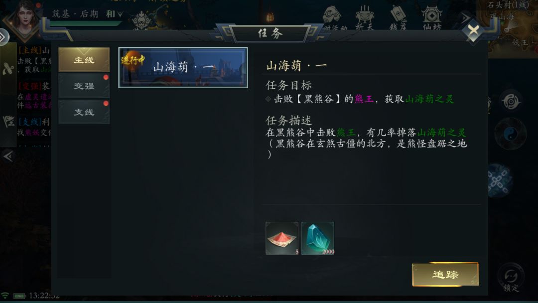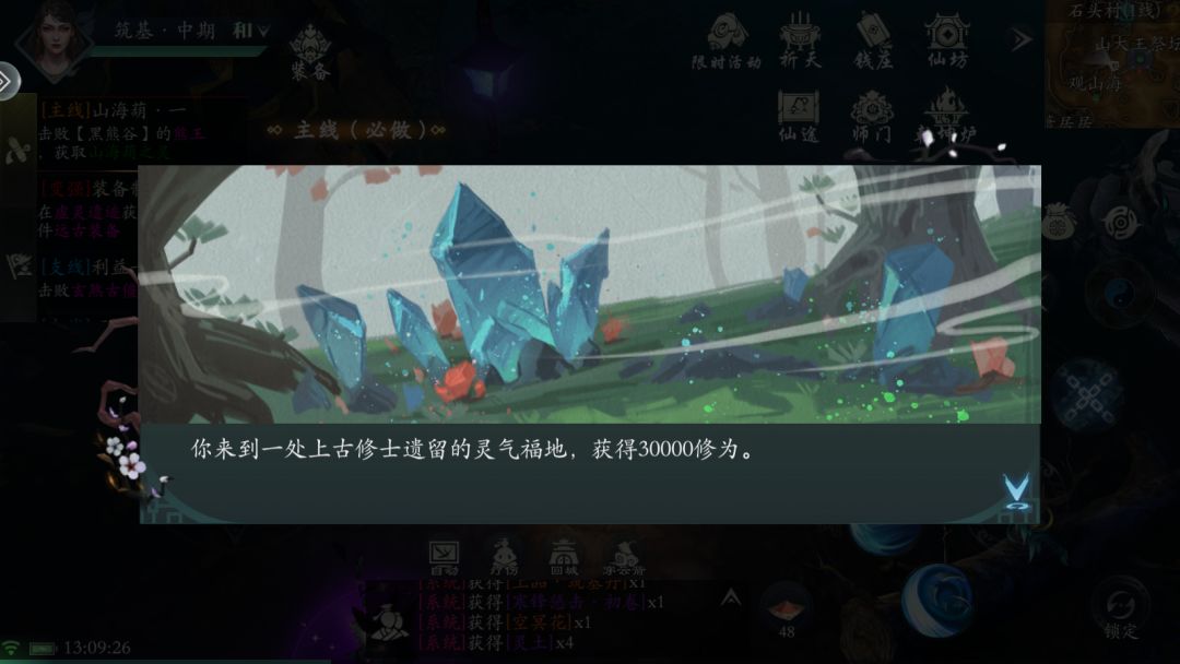 在师门任务和上述妖王首杀经验等等之后,修为突破到筑基后期,主线会解锁山海葫任务,这时跟着主线走,一边走一边获取首杀修为及使用灵气点即可。
