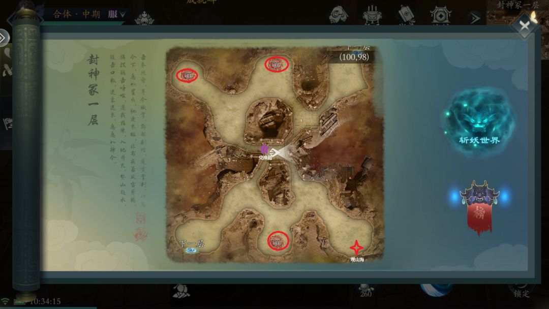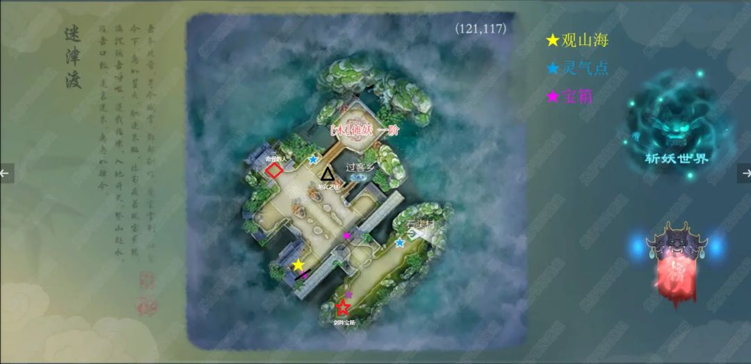 迷津渡相较于旧版地图,新增了左下角的剑阵宝箱(建议金丹期再来提取), 上方奇怪的人必须选择购买其售卖的神秘卷轴(可收藏或者清音小铺售卖掉),方便开启后续剧情,龙宫之柱是化神期奇遇,现阶段并无任何作用。