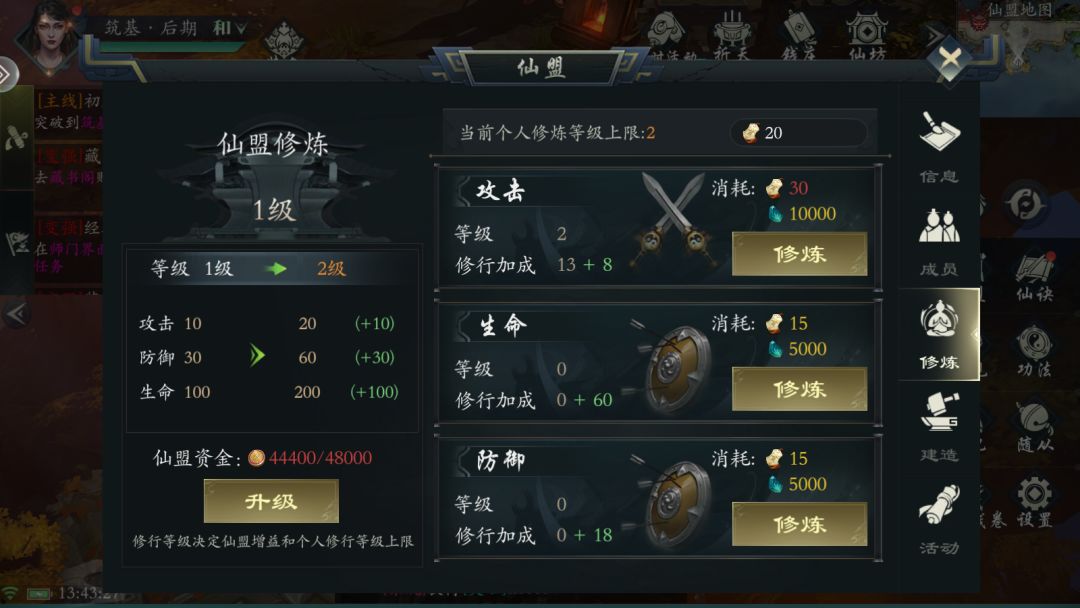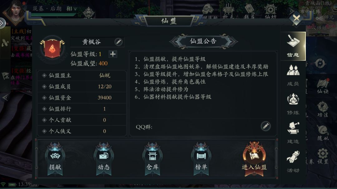 合成炼妖葫主线完成之后就会可以仙盟系统,需要先去七师兄npc处交互解锁仙盟,这里挑选一个人数较多的仙盟加入即可,仙盟打坐修炼记得金丹期再打坐,这样保证利益最大化。