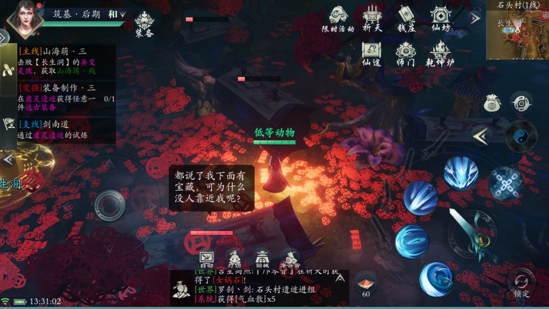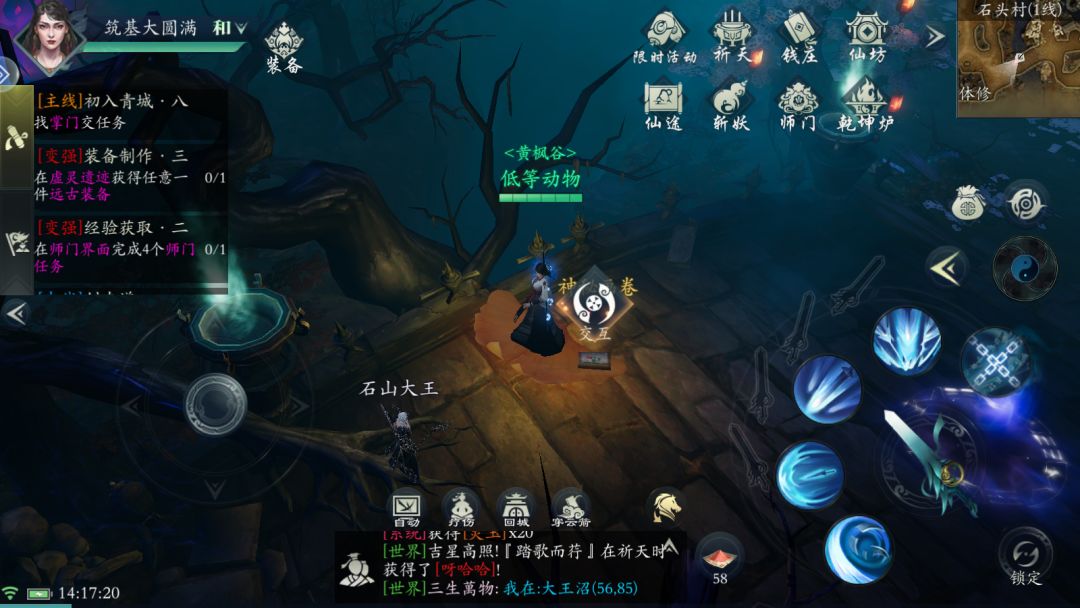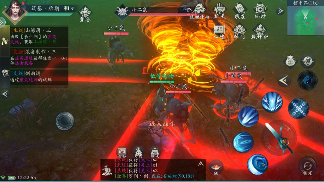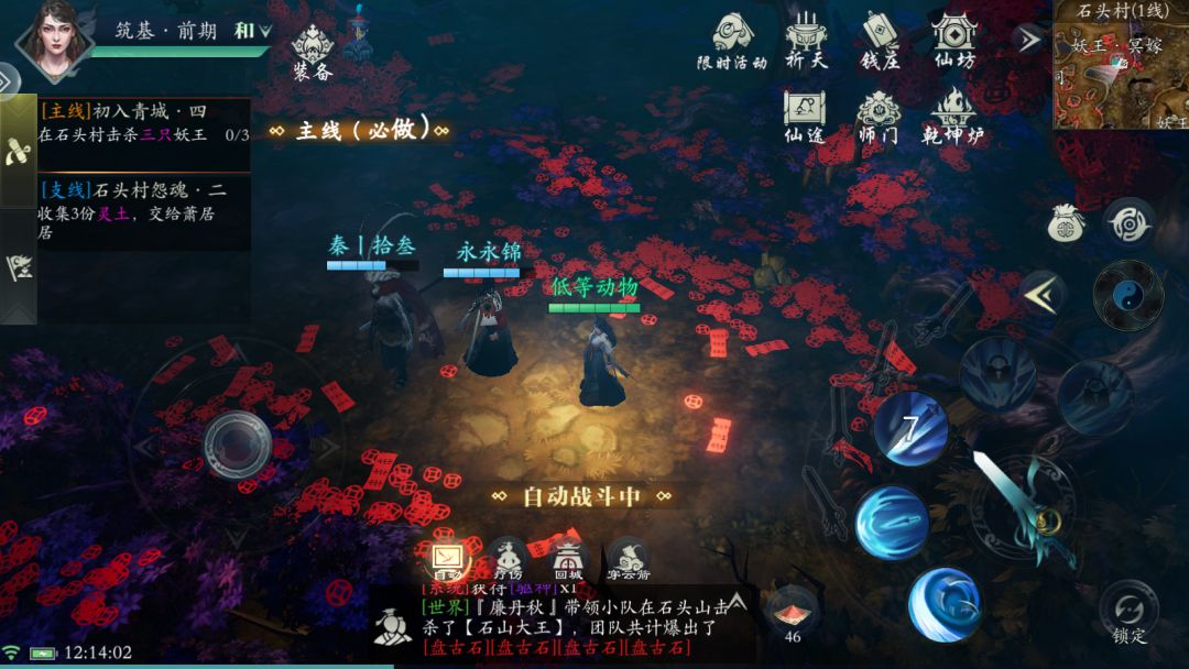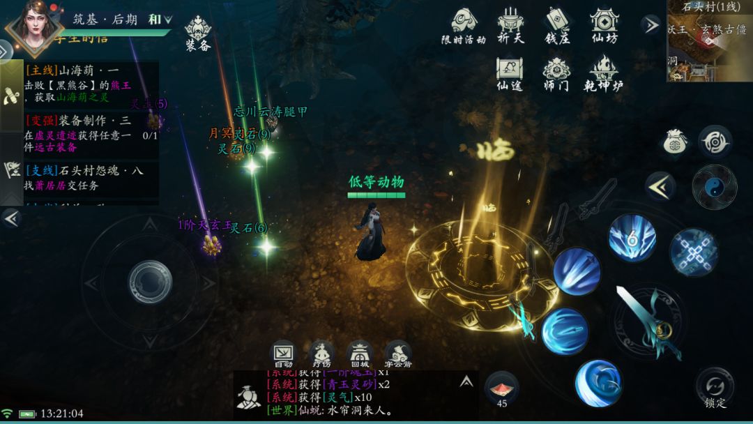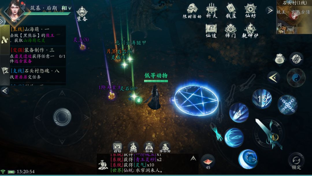 开荒升级建议:优先做完师门任务,换取四技能和大招,然后清理地图妖王拿首杀经验,石头村灵气点暂时不要使用,可以后续用于补修为使用,因为很多人会记混记乱,导致最后差修为没法升阶结丹,回头找修为就会浪费大量时间,其余小地图的修为和妖王首杀经验可以全部获取,记好就行。