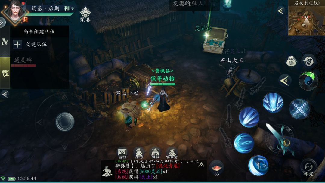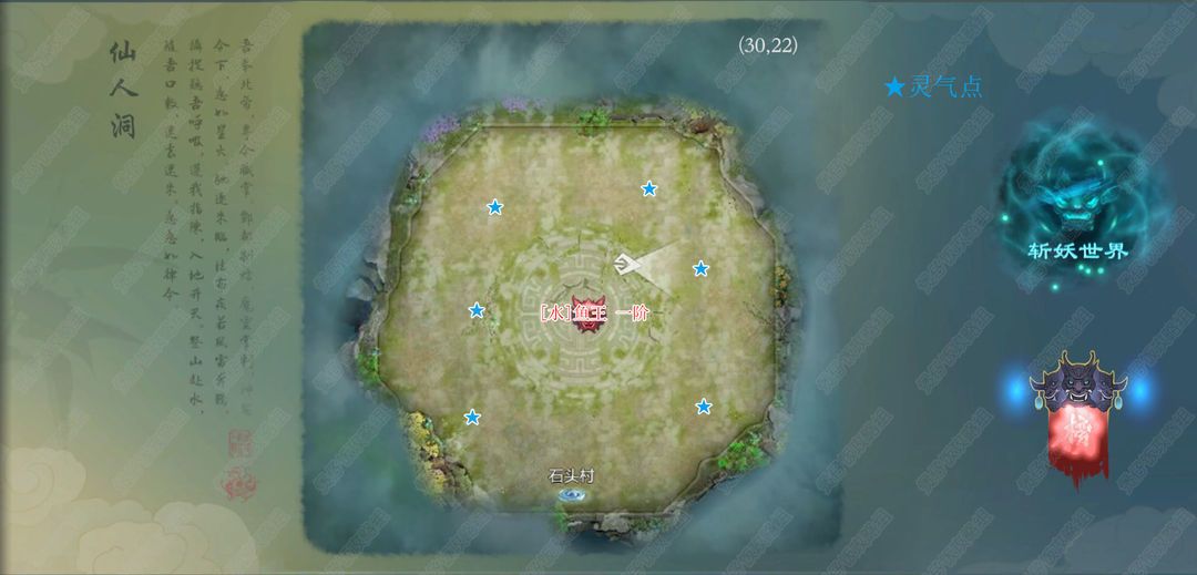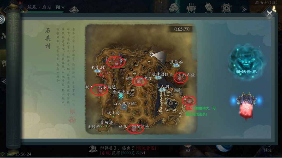 石头村妖王首杀经验获取完成后,前往仙人洞(仙人洞妖王可掉落灵根重塑丹,后续可以来此挂机获取,用于洗单水灵根使用)