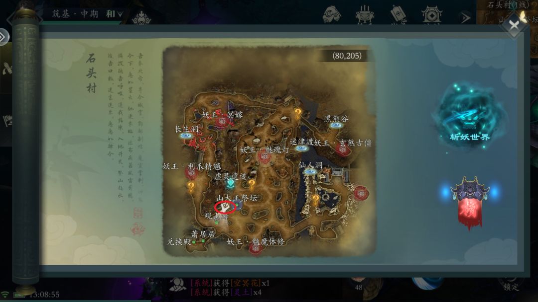 至此筑基快要接近尾声了,先去石头村拿一开始没动的灵气点。