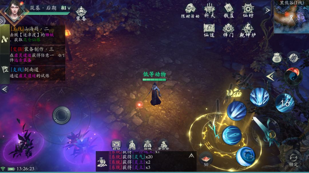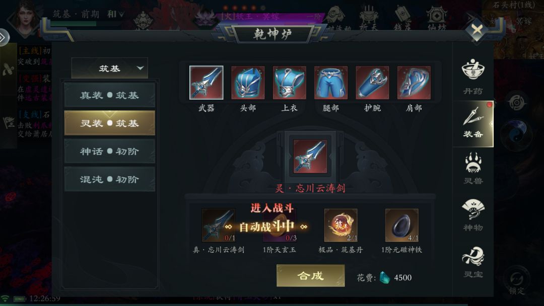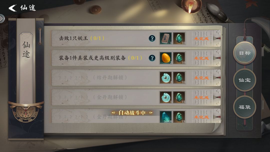 筑基仙途任务由击杀妖王数量和合成真&灵装备组成,因此需要我们在原地挂机20-30分钟左右才能进行后续,具体按照仙途任务完成时间为准,另外主线任务击杀三只妖王之后,去石头村左下方(门口)找掌门提交任务,会教学合成真装·武器,需要先做任务再继续挂机妖王·冥嫁。(仙途任务完成前切记不要与他人组队,因为你不能保证别人会不会打其他妖王,一旦发生这样就会白白丢失大量经验,得不偿失)