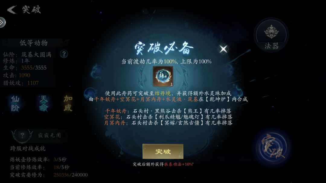 筑基期到这里就可以继续开荒了,优先到地图底部妖王·魅魔体修,击杀妖王后制作筑基丹·中品,筑基期的话能突破就直接突破,经验槽上限为当前进阶所需经验的十倍,因此筑基期很容易就满经验,这种状态下再去获取经验就会无效,因此需要经验够了就突破!