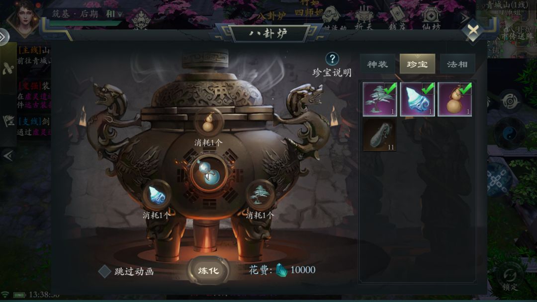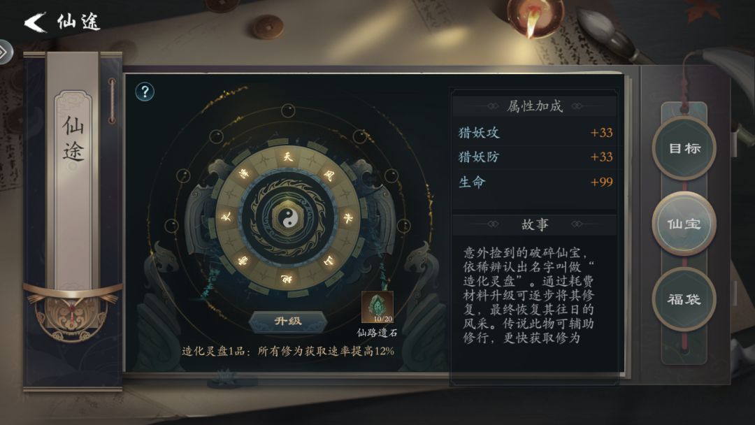 仙途任务完成后点击仙宝,对经验加成的造化灵盘进行升级,提高12%的经验获取