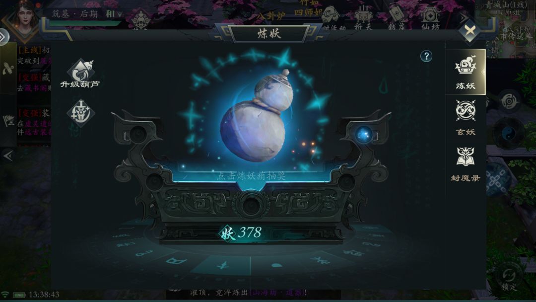 炼妖葫抽奖和每日师门任务一样,早上五点刷新,需要击败地图妖王*10之后才能抽奖,另外抽卡点数满了之后,右侧也可以抽奖,最好的奖励为:盘古石*1