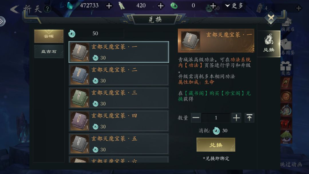 5.祈天获取得云晖可以兑换高阶功法(不限量):云晖*30=高阶功法*1