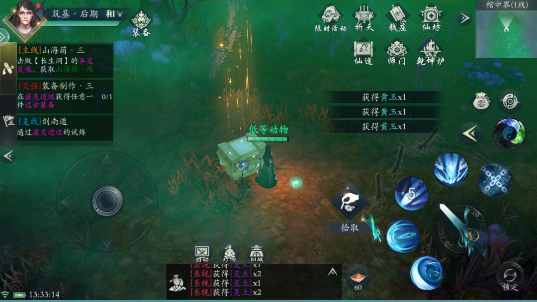 前往长生洞可以顺路去开启一下隐藏地图棺中界,进入可以获得大量黄玉和获取灵池升阶所需得幻仙石*1