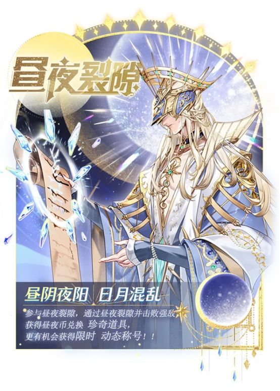 1、8月29日08:00至9月3日19:59期间,【昼夜裂隙】跨服竞技挑战限时开启,共分为【昼阴试炼】、【夜阳竞技】、【幻影裂隙】三类挑战