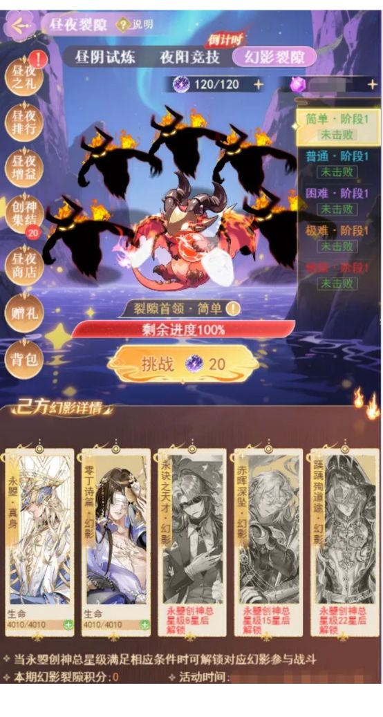 3、幻影裂隙共有五种难度:简单、普通、困难、极难、地狱,可根据推荐战力自行选择难度;五个难度下有多个的阶段,从阶段1开始挑战,击败上一阶段且等待复活时间结束后可进入下一阶段的挑战,挑战结束后可获得幻影裂隙积分、烬蚀影;永曌创神总星级达到22星及以上时,于幻影裂隙中每次挑战可额外获得“幻影宝藏”奖励,根据挑战难度和创神星级掉落数量不同,无需击败当前阶段每次挑战均可获得