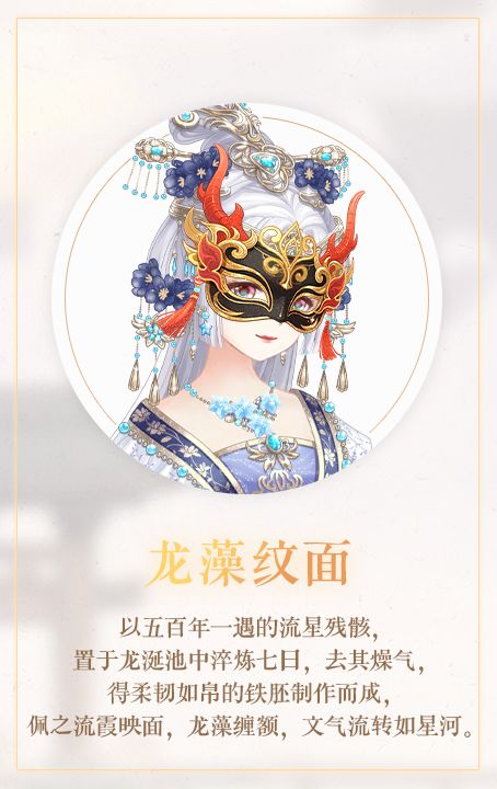 1、新增面具类型饰品:龙藻纹面,拥有侍从韦椿晞且其信物达到5星可解锁制作