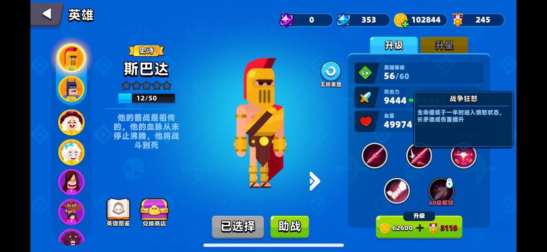 3.第三个就是英雄问题,目前我觉得最好用的还是主线打到第7关解锁的冰雪女王,往建筑物扔雪花会有冰墙出现,冰墙伤害远比普通雪花高,往自己脚下扔还能当屏障阻挡远程敌人的投射物,我就是靠这一招熬过了很多关。然后紫色英雄就最初的弓箭手比较好用,因为最容易升星,送的斯巴达伤害高,还有扔兔子的角色也还行。每个英雄搭配的技能也比较有讲究,像散射就很适合各个英雄,然后追踪就不适合要靠地形的英雄,比如冰雪女王和扔兔子的,适合斯巴达,这个新手要注意一下。